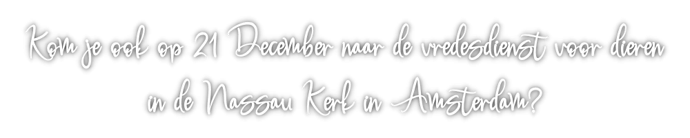 Dit jaar organiseren we alweer voor de 12de keer de Vredesdienst voor dieren op zondagmiddag 21 december a.s. van 16.00 uur (inloop 15.30 uur) tot uiterlijk 18.00 in de Nassaukerk, De Wittenkade 111 in Amsterdam.