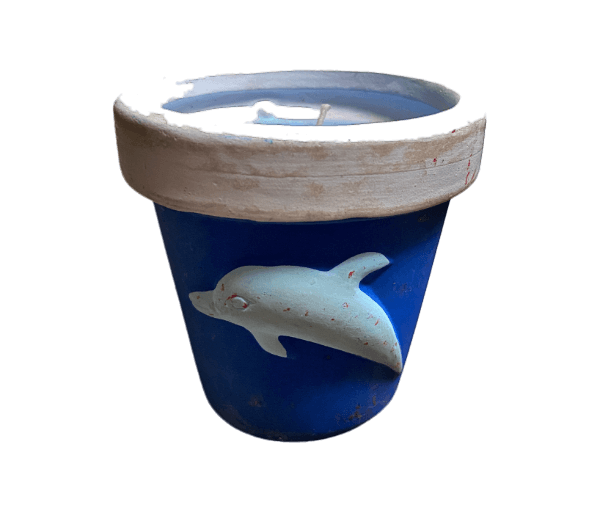 Mooi aardewerk potje met 3D dolfijn als decoratie en geurkaars. Afmetingen: 8x7x7 cm.