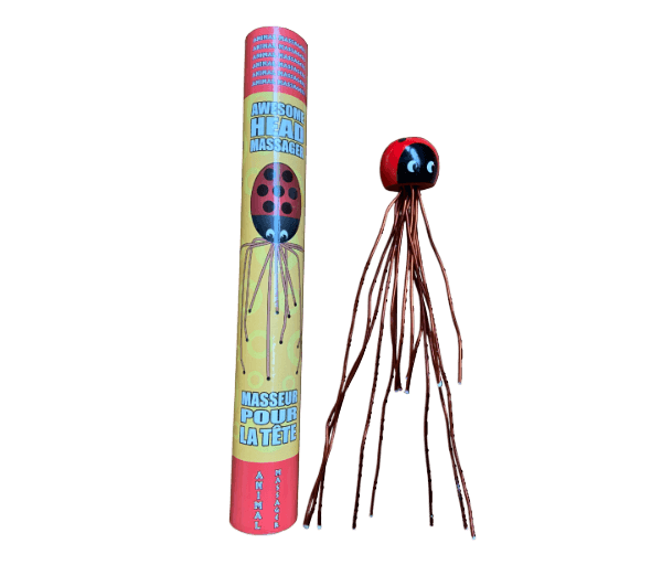 Supergrappige hoofdmassage in de vorm van een houten lieveheersbeestjeslijfje met metalen massagepootjes, die zijn afgewerkt met witte beschermtipjes.
