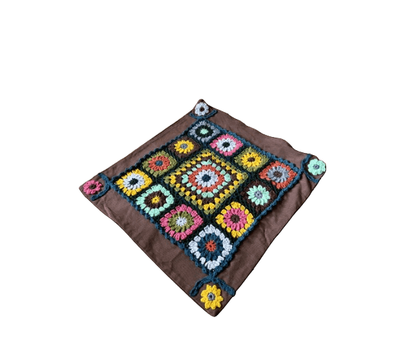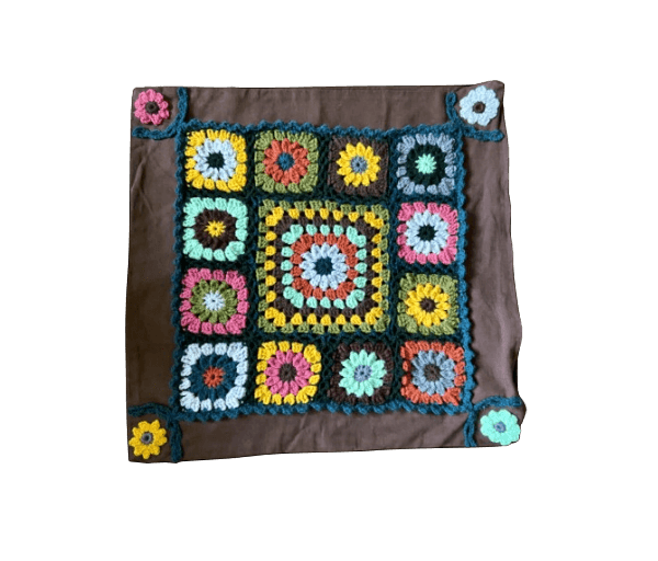 De ene kant gehaakt patchwork in bloemmotieven in herfstkleuren met een groene buitenrand en sierbinnenranden en in de hoeken nog een gehaakte bloem; de andere kant is van bruine stof.