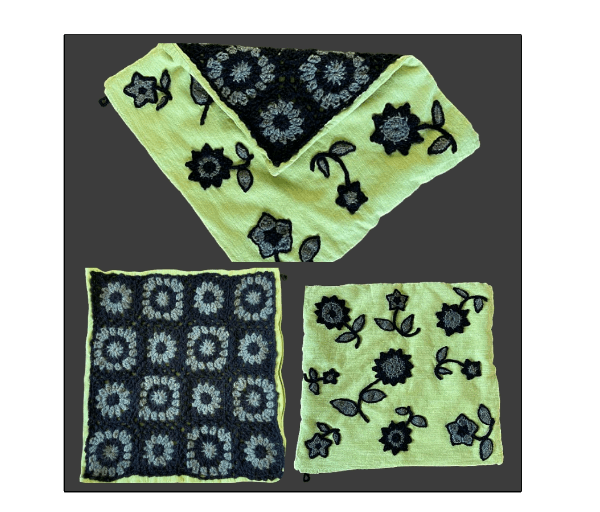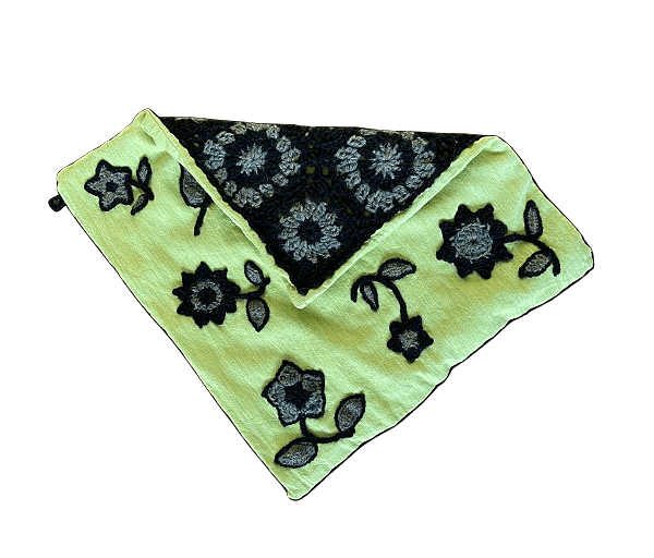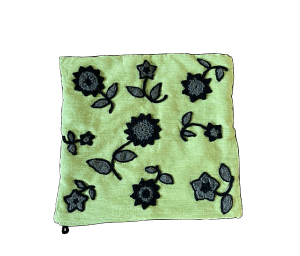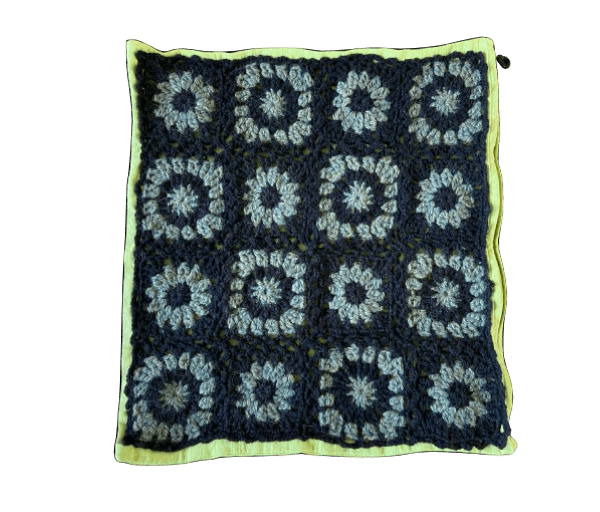 De ene kant gehaakt bloemenpatchwork in de kleuren zwart en herfstgroen met een zwart geschulpte buitenrand en zwarte sierbinnenranden – bevestigd op een limoengroene kussenhoes; de andere kant is voorzien van prachtige gehaakte bloemen in diverse afmetingen met blaadjes en stelen in dezelfde kleuren als de andere kant.