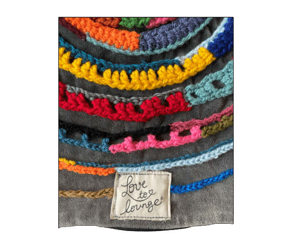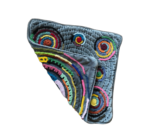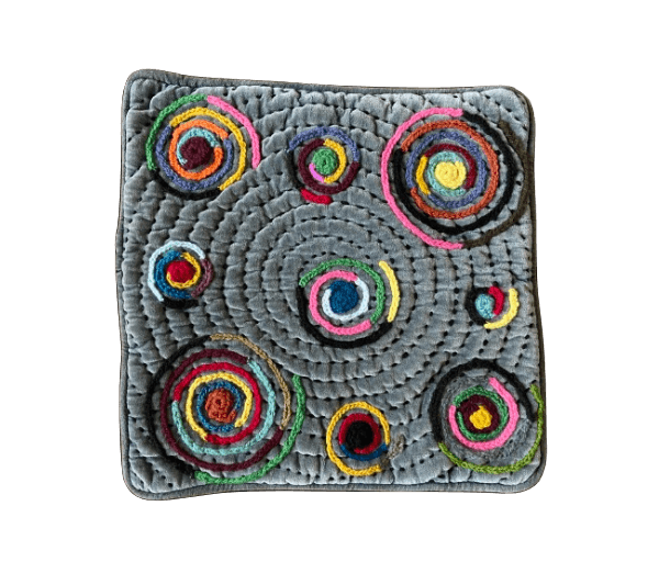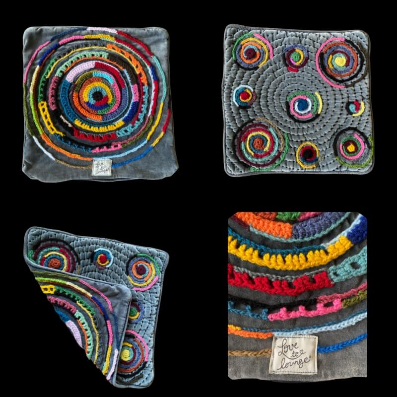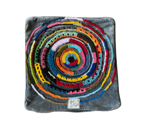De ene kant 9 gehaakte gekleurde cirkels – bevestigd op een grijs fluwelen kussenhoes met cirkelreliëf; de andere kant is voorzien van 1 grote gehaakte gekleurde cirkel die steeds wijder en smaller wordt qua haakwerk.