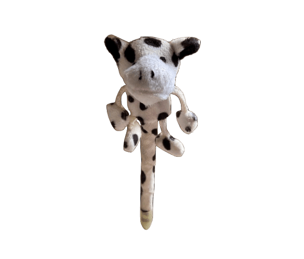 Leuke zwartschrijvende pen met er bovenop een pluche koetje met bungelpootjes.