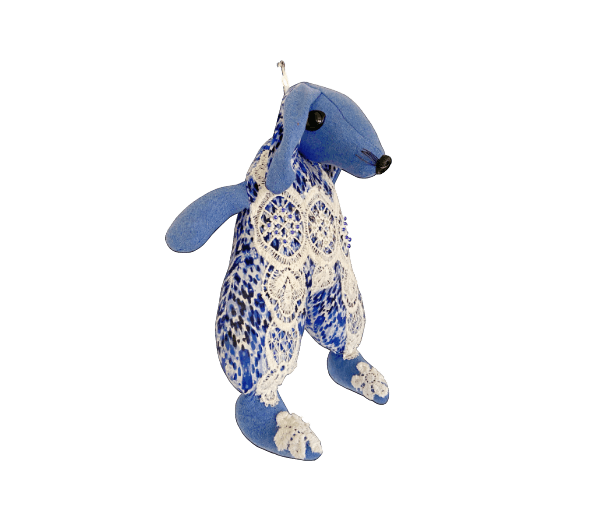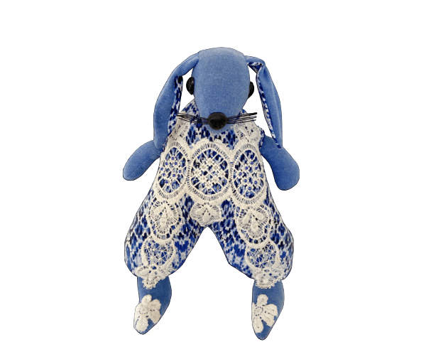 Mooi blauw konijn met wit kanten pakje aan.