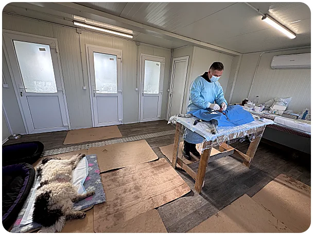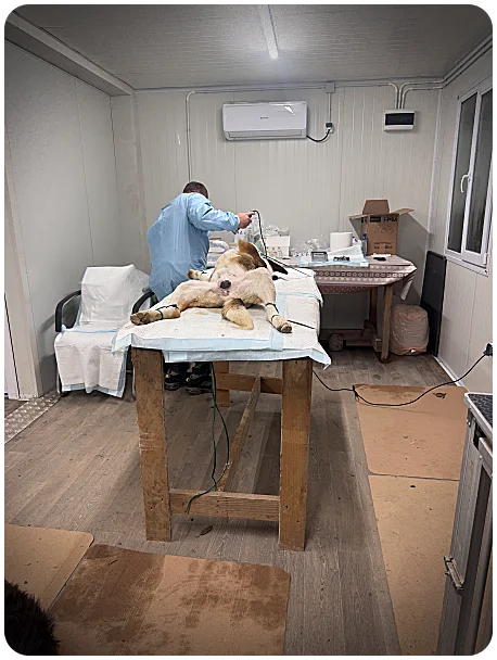 🌞 Een belangrijke mijlpaal was het plaatsen van een 6x6 container die nu dient als kleine dierenartsruimte waar sterilisaties kunnen worden uitgevoerd en waar drie herstelkamers beschikbaar zijn voor speciale gevallen en honden die herstellen na een operatie. Een deel van de gedoneerde middelen werd gebruikt om het terrein voor te bereiden zodat de container veilig kon worden geplaatst, en om een septische tank te installeren en de container daarop aan te sluiten, zodat de ruimte goed en hygiënisch kan functioneren.